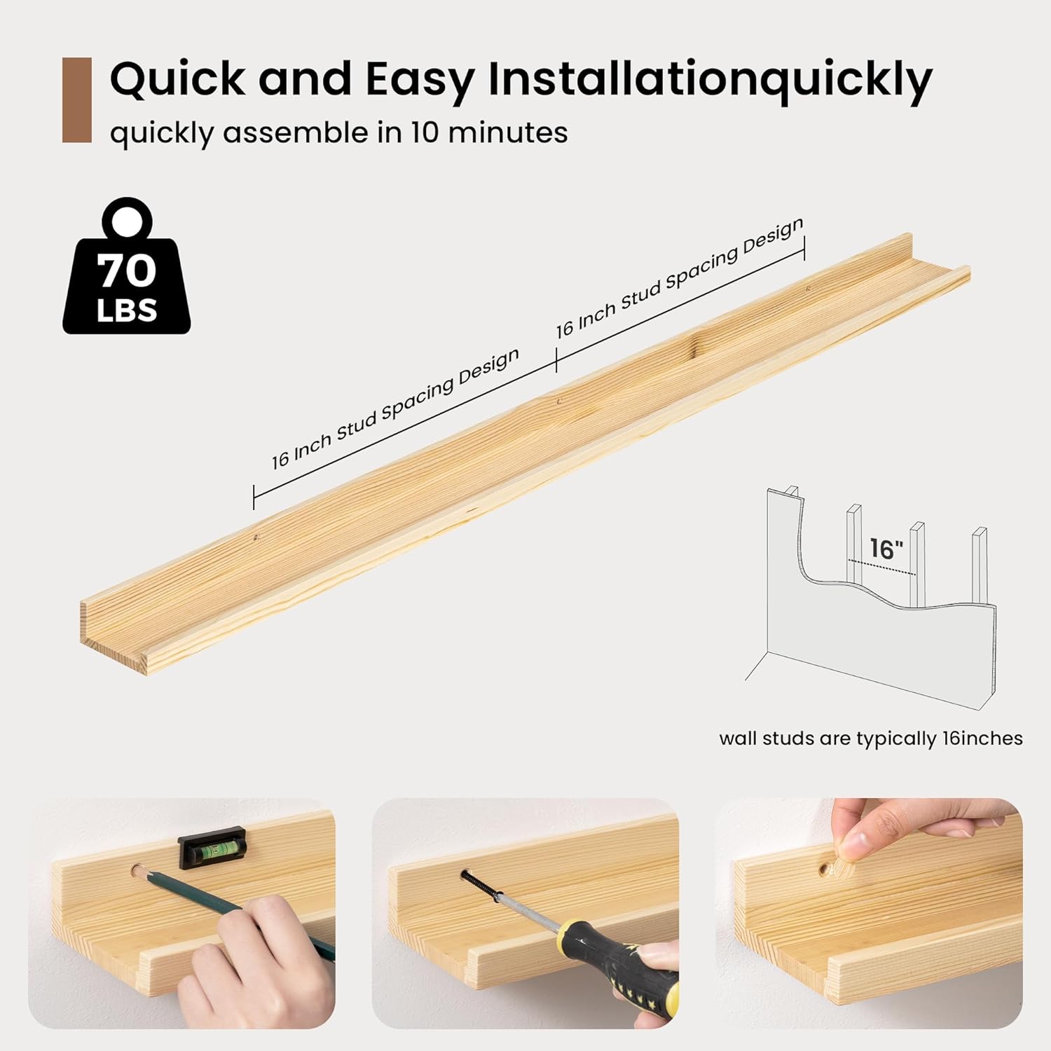 - Unique Solid Pine Wood Shelves: Each picture ledge is meticulously handcrafted from premium solid pine wood, showcasing one-of-a-kind grain patterns, organic color variations, and a hand-finished texture. No two shelves are identical—transform your space with a bespoke touch that reflects your individuality
