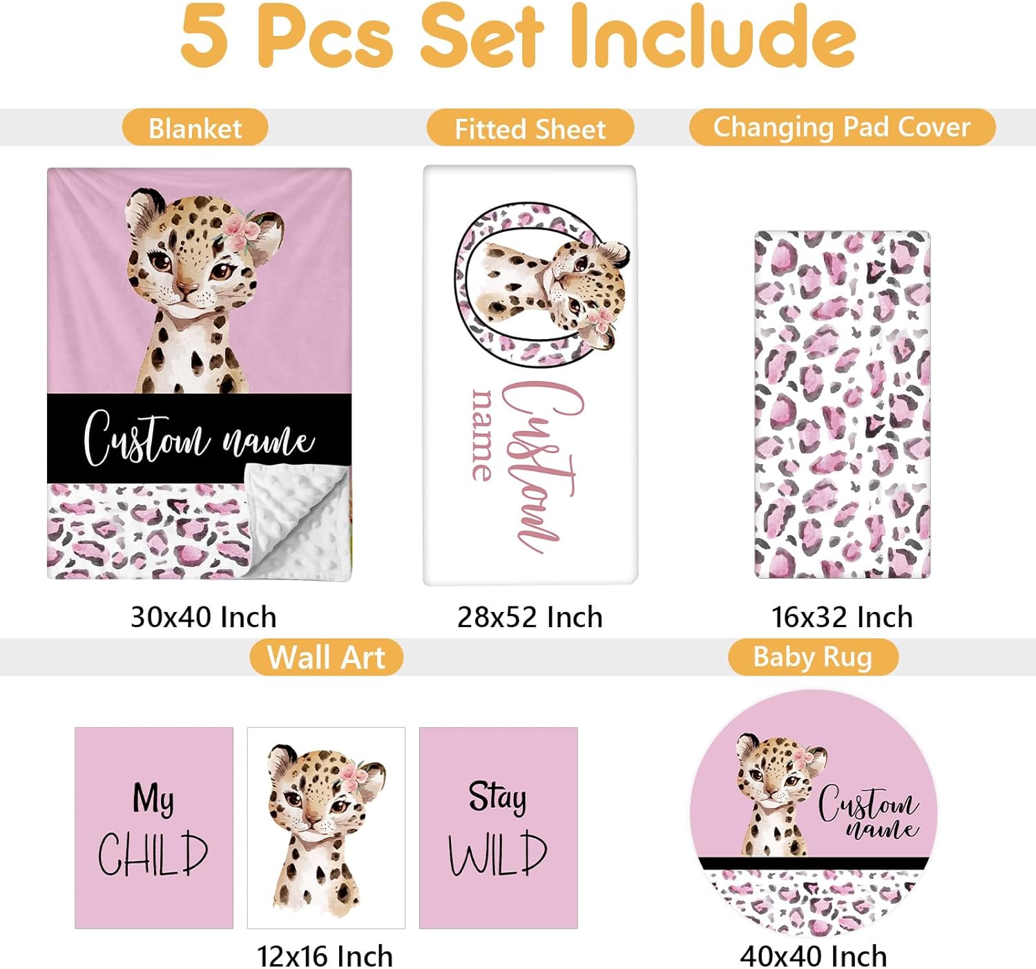 Personalized Baby Bedding Set, 5 Pcs Custom Baby Crib Sets with Name, Toddler Bedding Set for Baby Girls, Pink Leopard Double Layer Nursery Bedding Set, Customized Gifts for Infants Kids