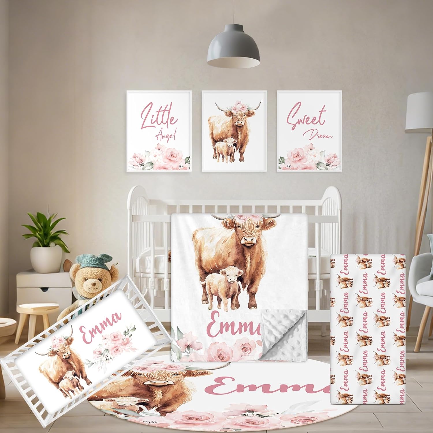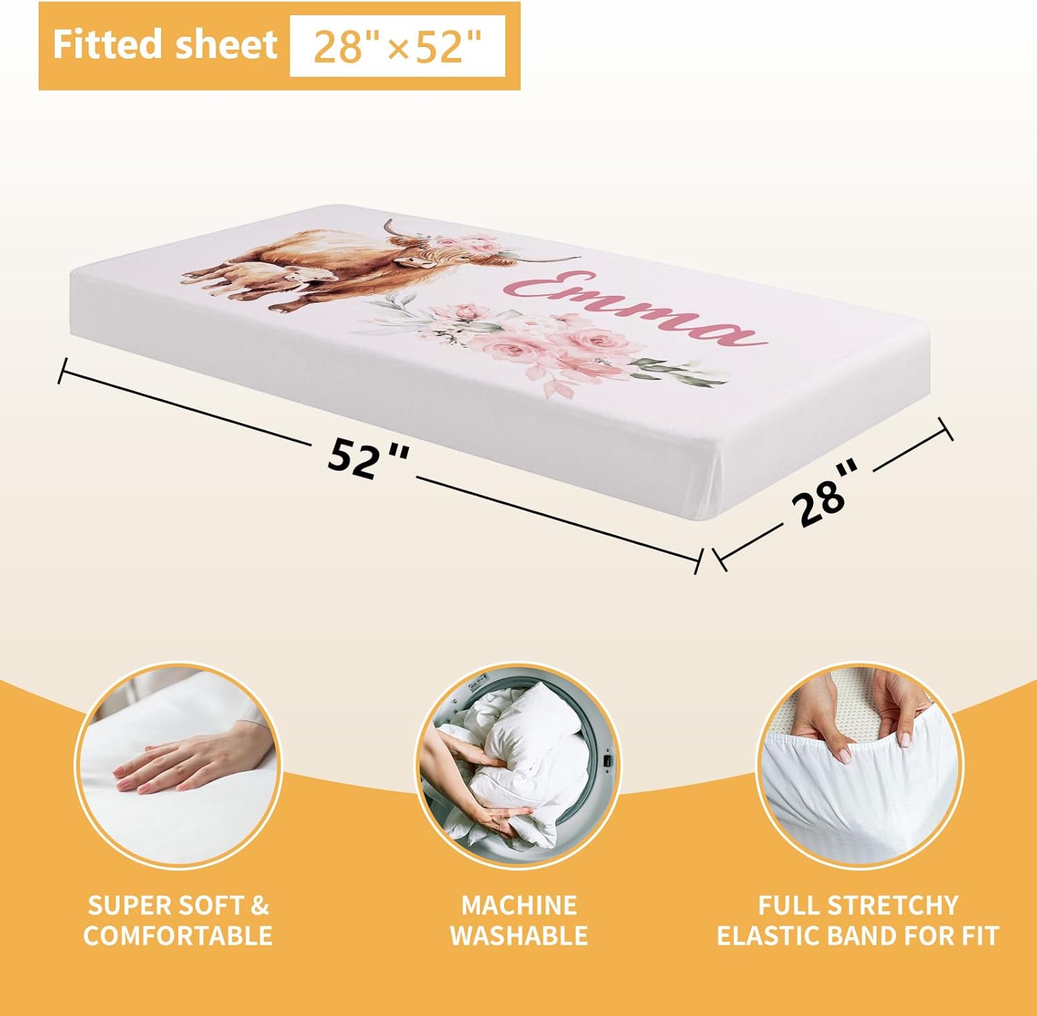 Personalized Baby Crib Bedding Set, 5 Pcs Custom Name Nursery Bedding Set, Pink Highland Cow Baby Bedding Set for Girl, Double Layer Baby Crib Sets, Customized Gifts for Toddlers Kids Infants