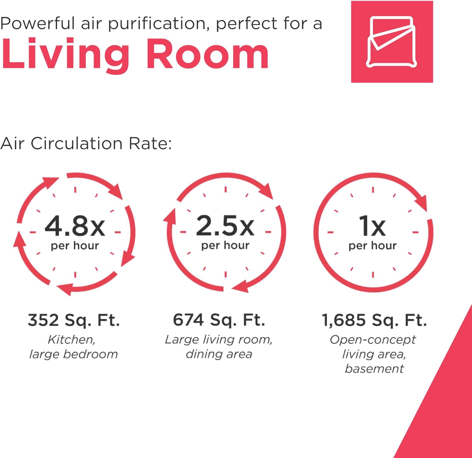 - Continuous Air Circulation: This air purifier filters the air 4.8x per hour in rooms up to 351 sq. ft. or 1x per hour in rooms up to 1,685 sq. ft., ensuring consistent air quality and freshness*