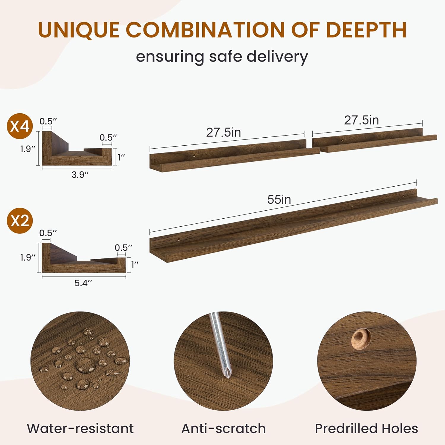 Axeman Picture Ledge Shelf, Floating Shelves for Wall Decor Storage Set of 6, 55 inch Floating Wall Mounted Shelves, Wall Shelves with Lip for Living Room, Bedroom, Nursery, Bathroom, Kitchen, Walnut