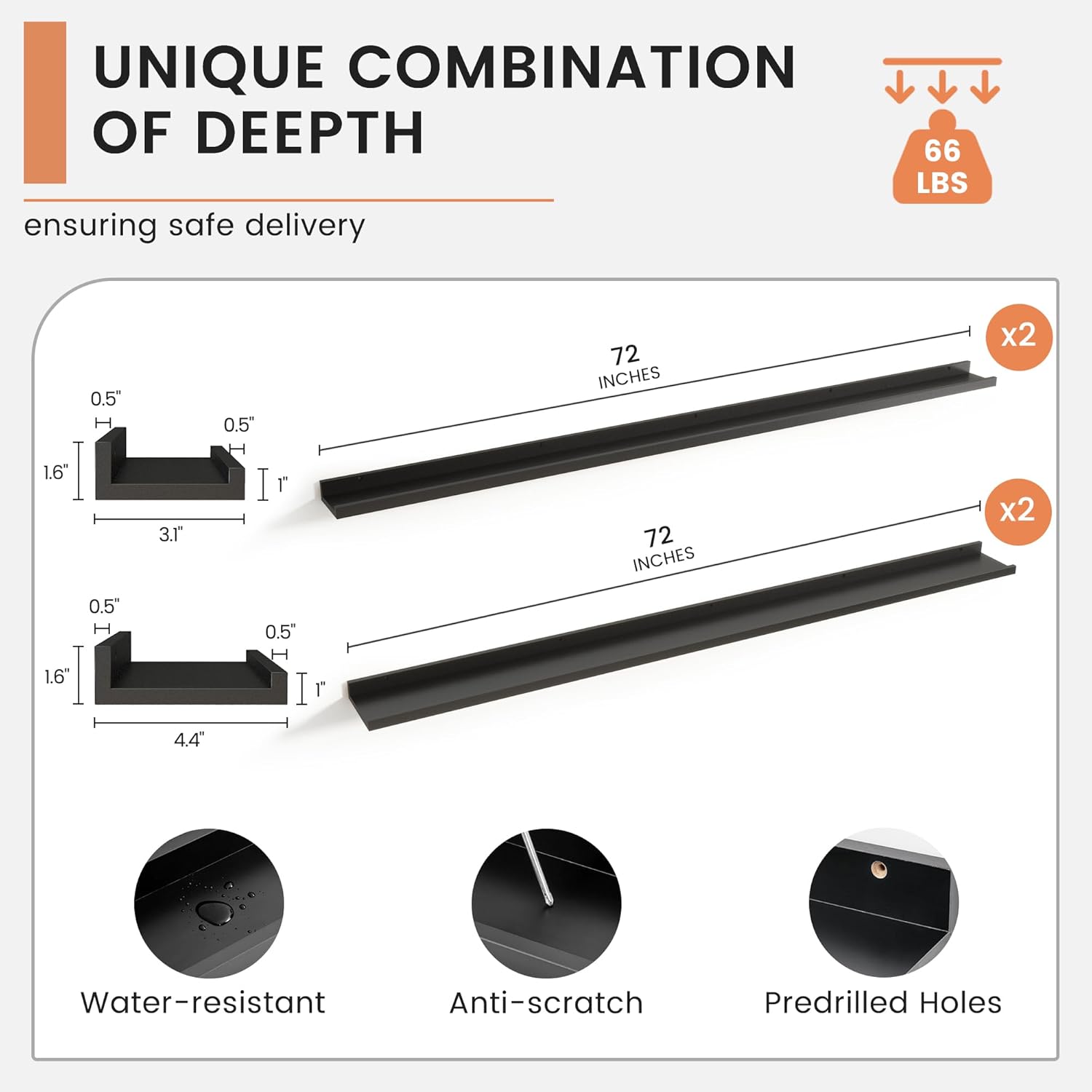 Floating Picture Ledge Shelves for Wall Set of 4, 72 Inch Wall Shelves with Lip Long Large Nursery Book Shelf for Toys Storage Kids Bookshelf Wall Mounted Living Room Bedroom Decor Frames