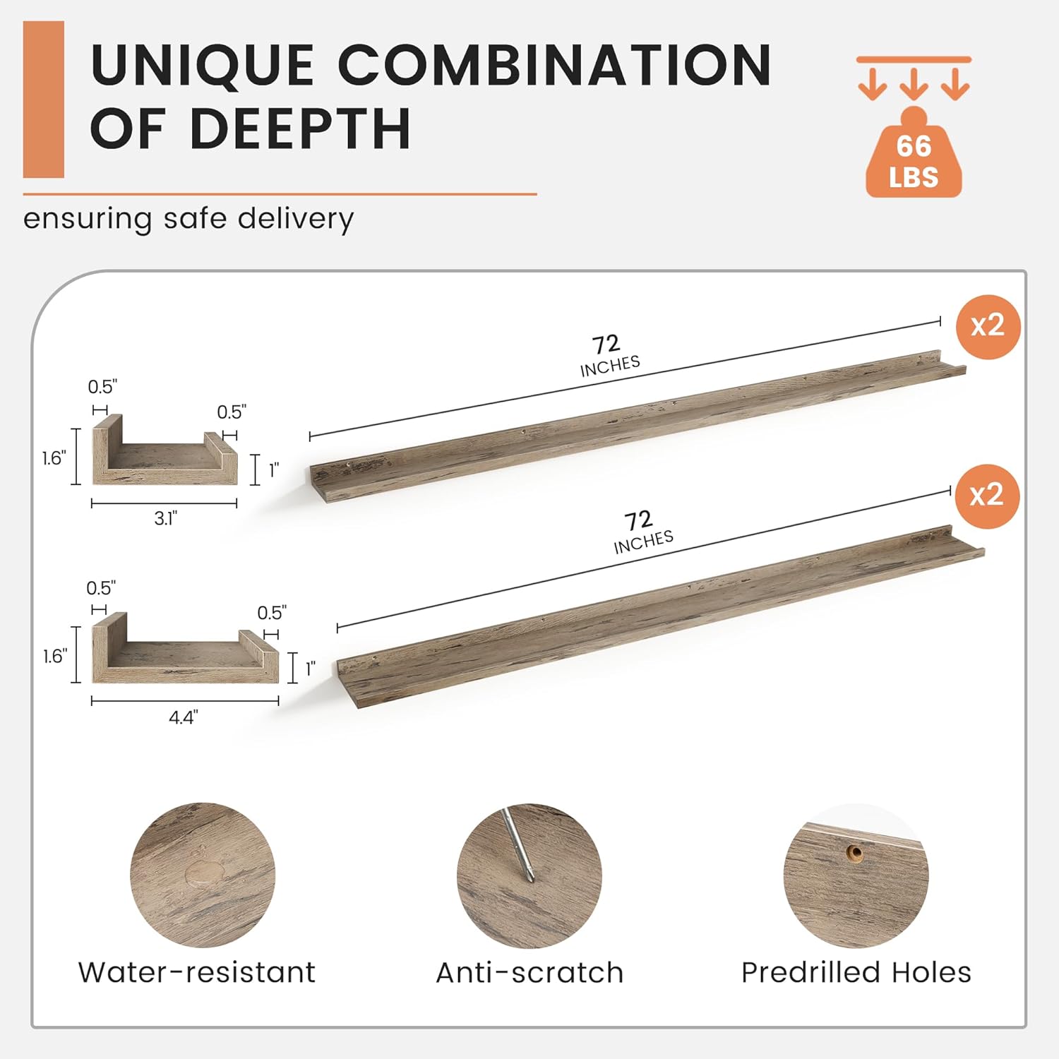 Floating Picture Ledge Shelves for Wall Set of 4, 72 Inch Wall Shelves with Lip Long Large Nursery Book Shelf for Toys Storage Kids Bookshelf Wall Mounted Living Room Bedroom Decor Frames
