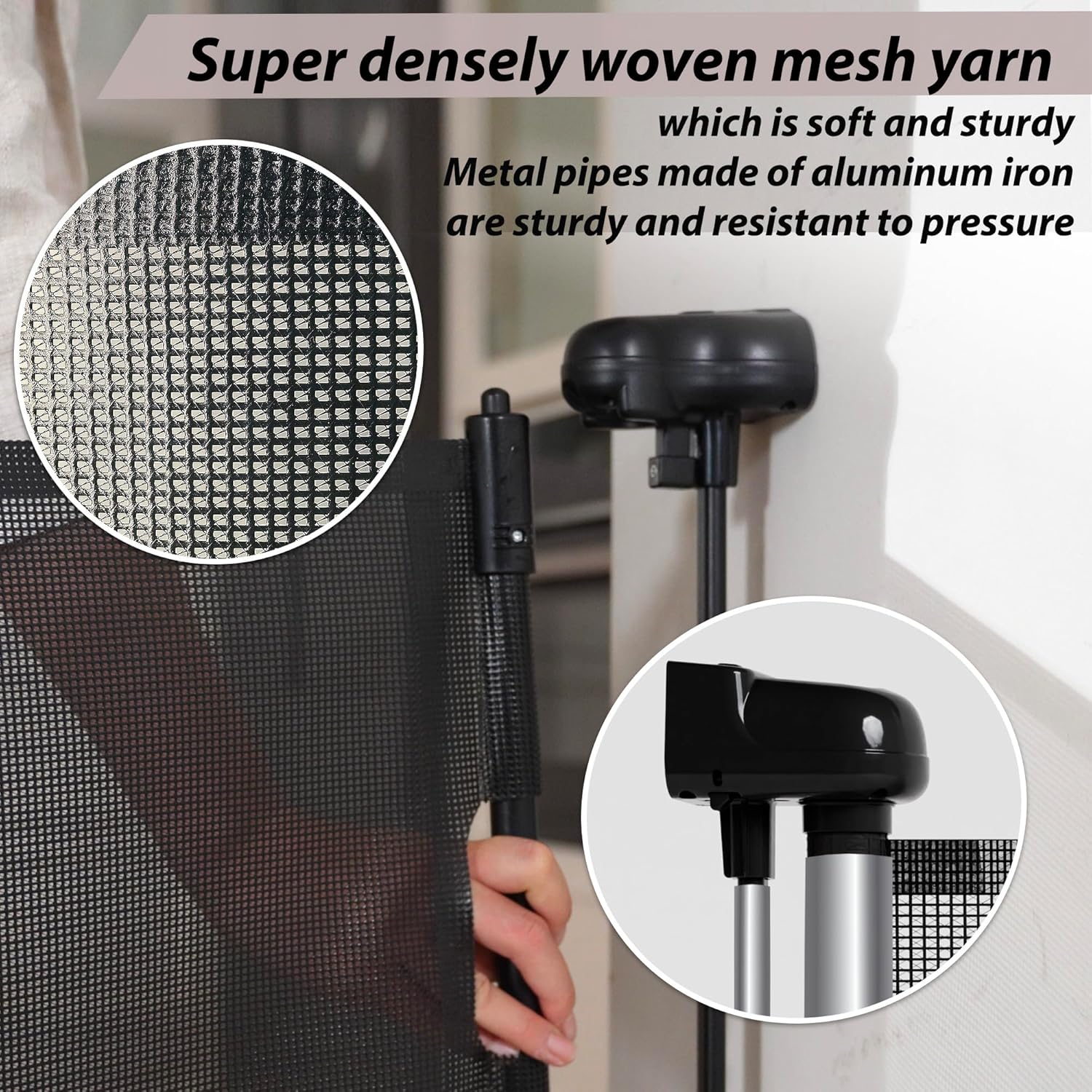 - Safety Double Lock Design - The retractable mesh gate features two locking mechanisms: a mesh lock that controls the mesh's extension and retraction, and a hidden gate lock for opening and closing the gate. Designed for adult convenience, it remains particularly challenging for children, effectively preventing them from opening the gate alone and accessing hazardous areas.