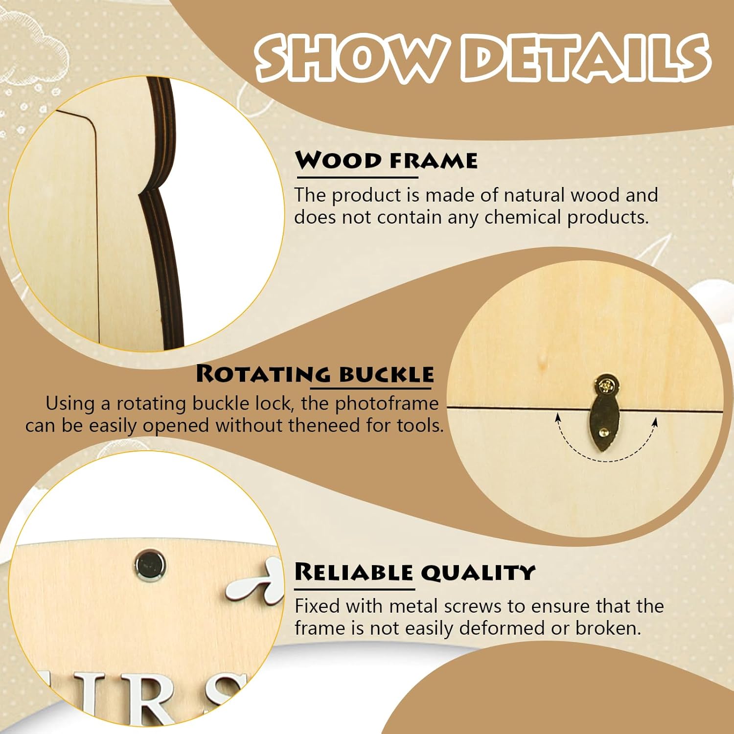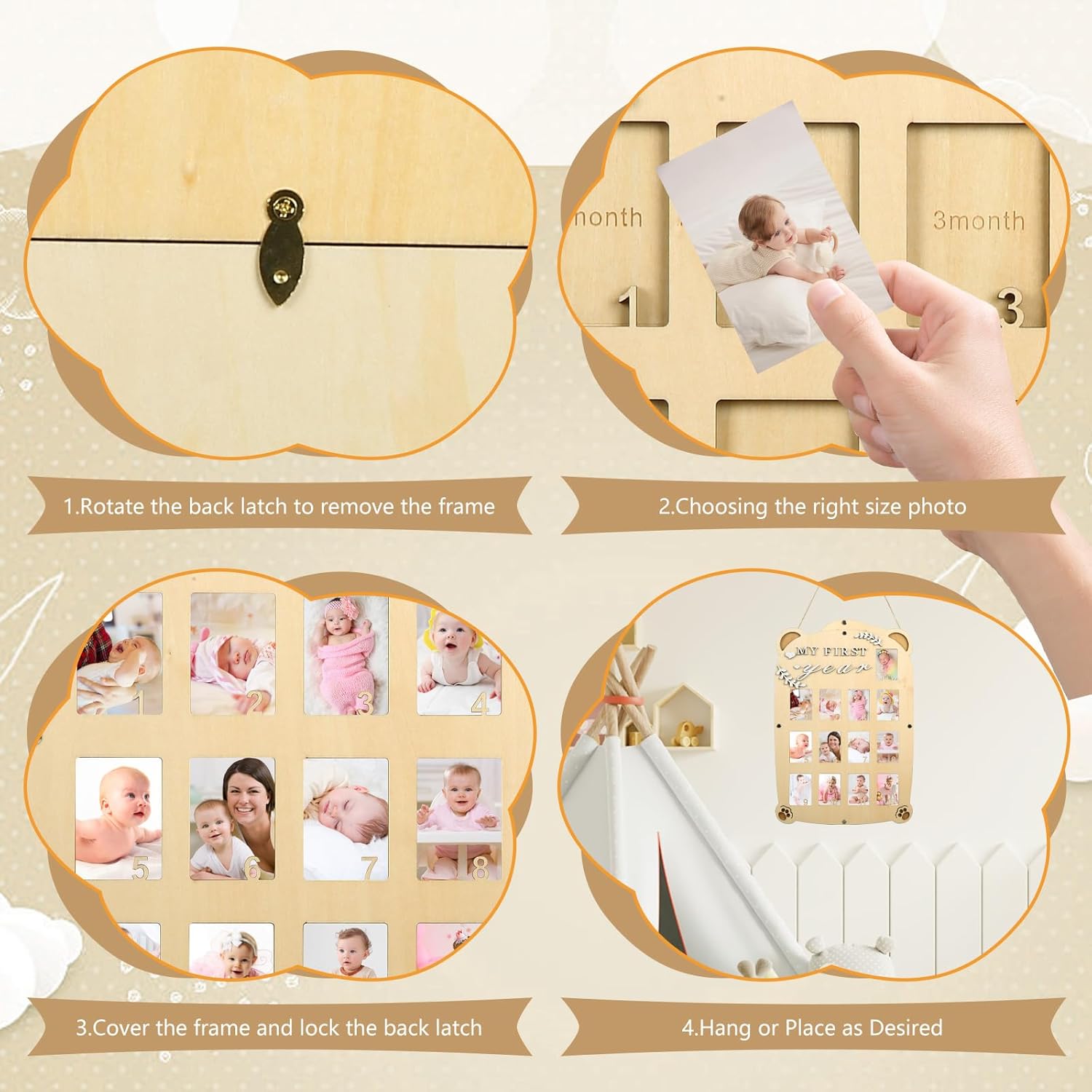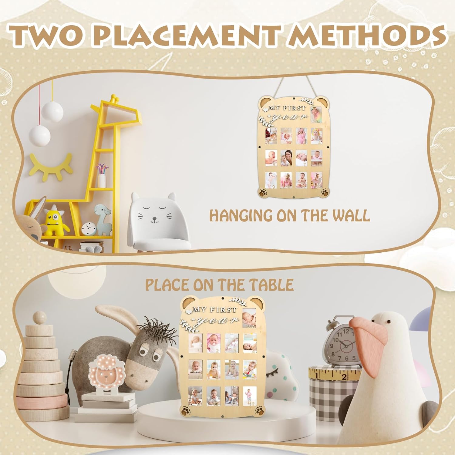 - SIZE & MATERIAL: My first year milestone board size 16.1" high x 11.7" wide, made from 2/5" thick premium wood,smooth and reusable,not easy to fade or peel.fits 1.8" x 3" photos (Wallet Size),easy to use.