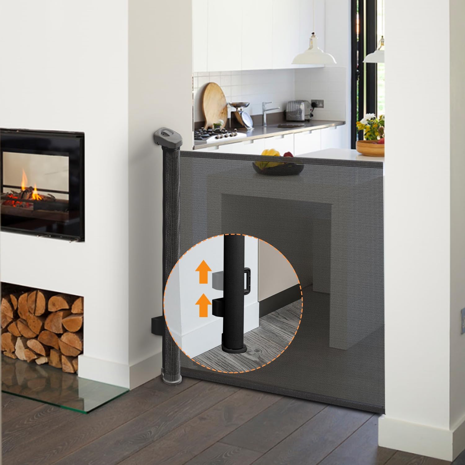 - 【Durable Construction, Safe to Use】This retractable door is made of sturdy and soft mesh design, which prevents our babies from getting any injuries when they accidentally hit the door. All parts are non-toxic and odourless, all door cords are tested for safety standards and meet pass or exceed EN standard test.