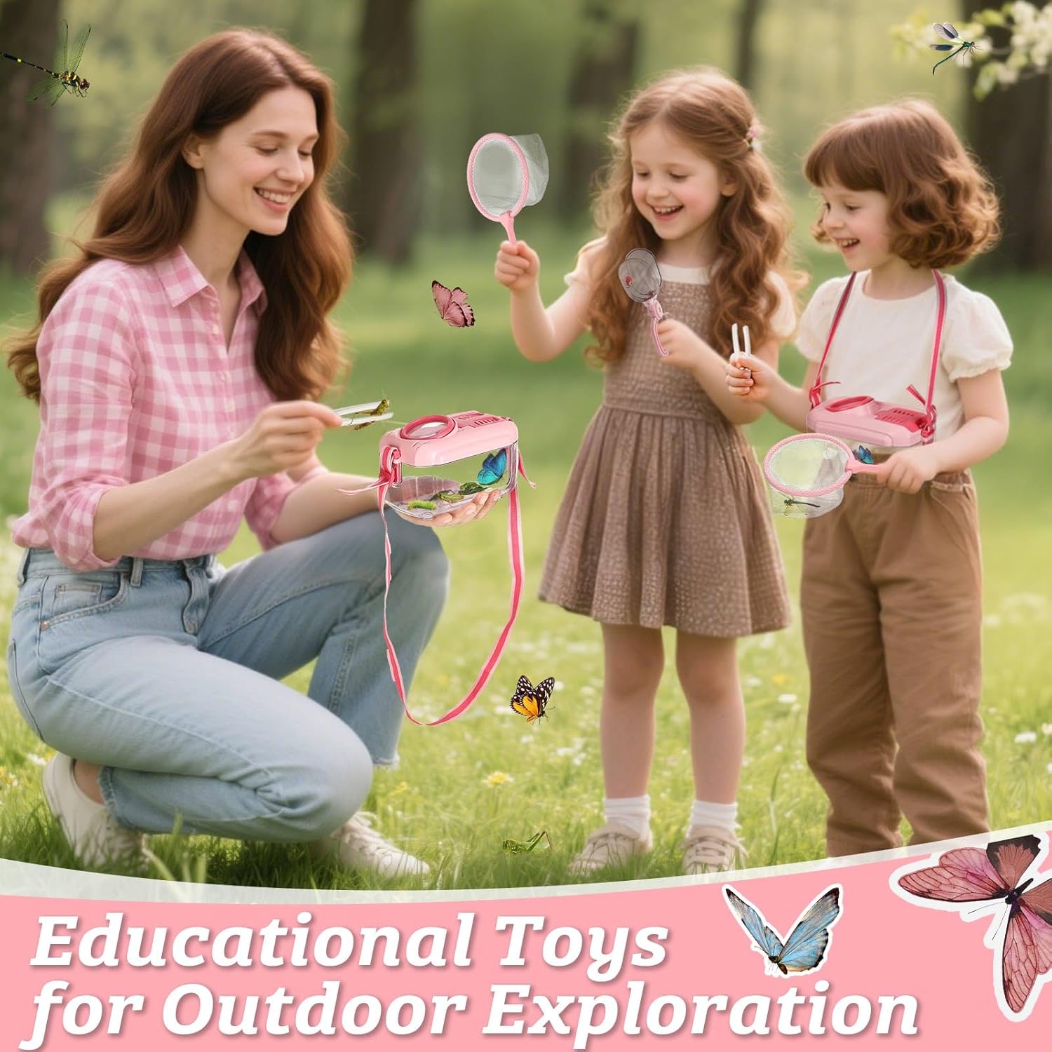 2 Set Bug Catcher for Kids- Educational Bug Catching Kit Including Butterfly Net, Insect Clip, Tweezer, Outdoor Toys for Kids Ages 3-10 (Pink)