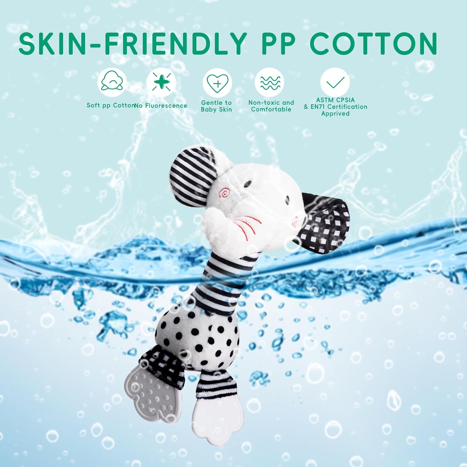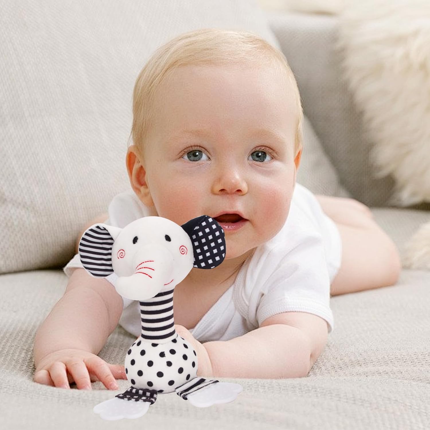 Black & White Elephant Baby Toys 0-12 Months - Plush Sensory Rattle with Teether, Wind Chime, BB Squeaker & Embroidery for Visual, Hearing & Cognitive Development