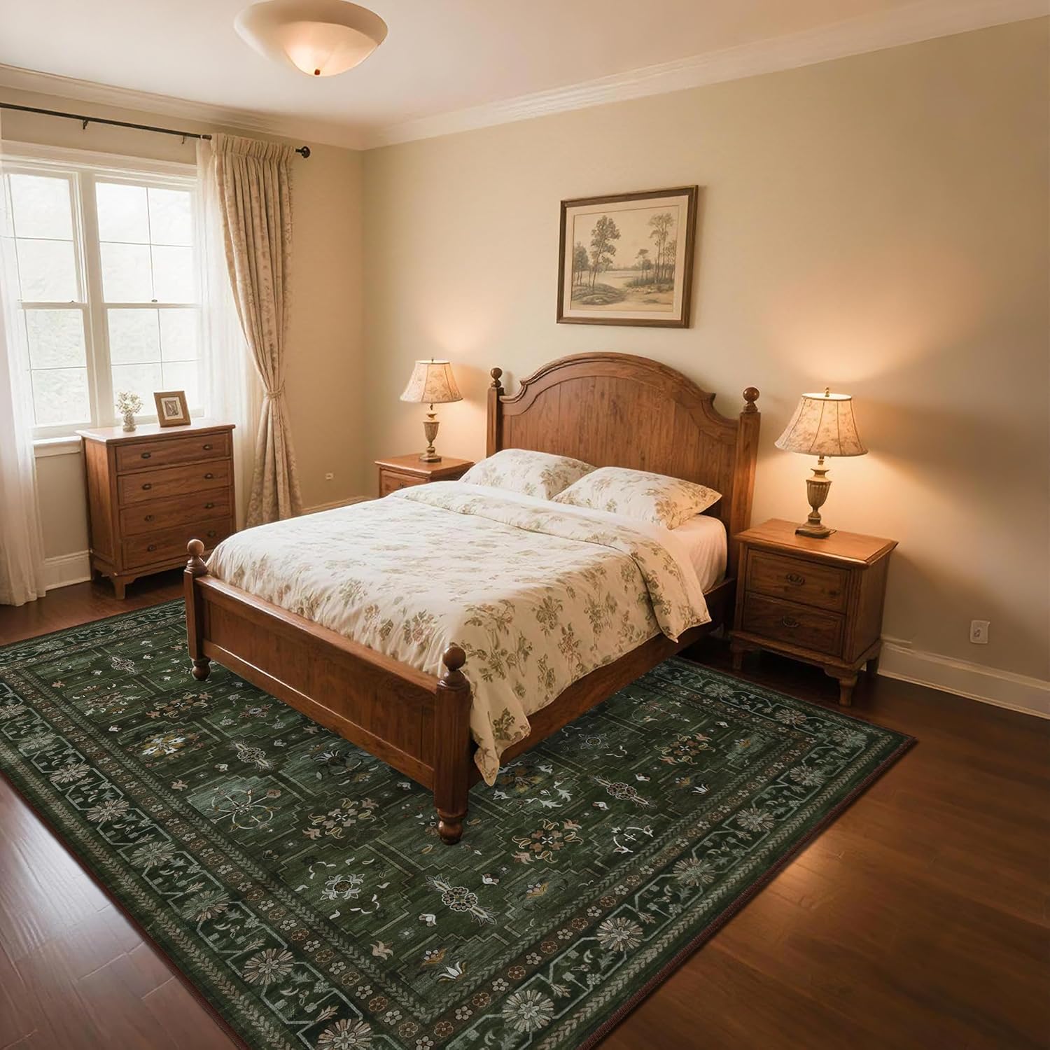 5x7 Washable Area Rug for Living Room Dining Room, Distressed Non Slip Vintage Floral Rugs for Bedroom, Traditional Indoor Floor Carpet for Dining Kitchen Farmhouse Dark Green