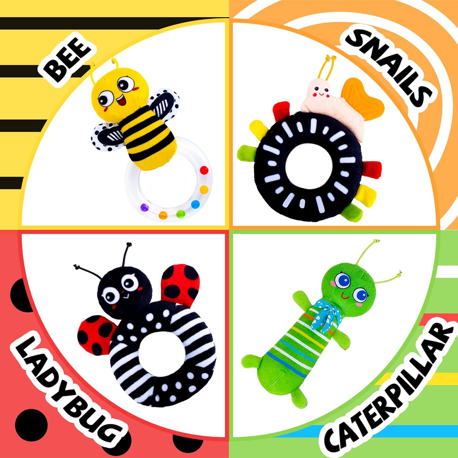 - 【Multi-Sensory & Cognition Development】The sounds that capture attention and aid in auditory development. The toy helps develop tactile sensitivity and visual processing. The vibrant colors of the caterpillar and bee, along with the high-contrast black and white patterns of the snail and ladybug, are specially chosen to aid in your baby's visual acuity. It is a perfect learning and educational toy for babies to develop cognition.