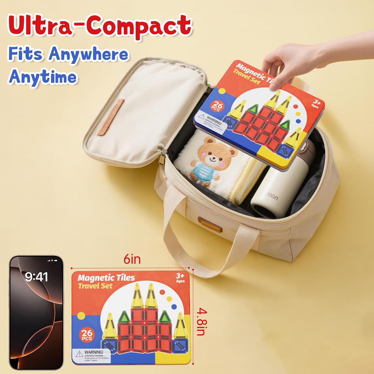 - Ultra-Portable Travel Companion: A compact 26-piece magnetic tiles set with a slim iron box (6.04 x 4.77 x 0.59 in) and a secure latch fits easily in backpacks for play anywhere—airplanes, road trips, classrooms, restaurants, hotels, or outdoor camping