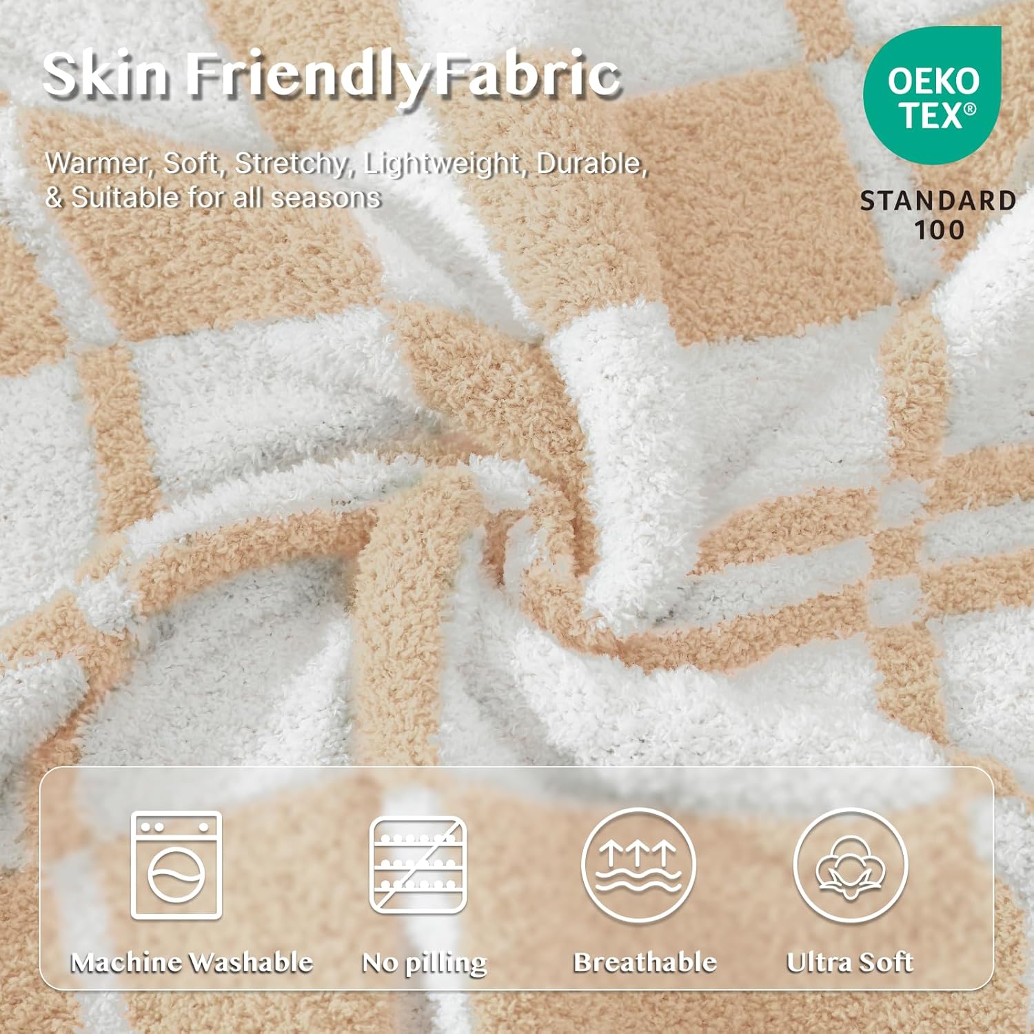 WRENSONGE Checkered Throw Blanket, Toast Almond Soft Cozy Fluffy Warm Hand Made Throw Blankets for Couch, Sofa, Chair, Bed, Camping, Picnic, Travel Lightweight Bed Blanket - 50"*60"