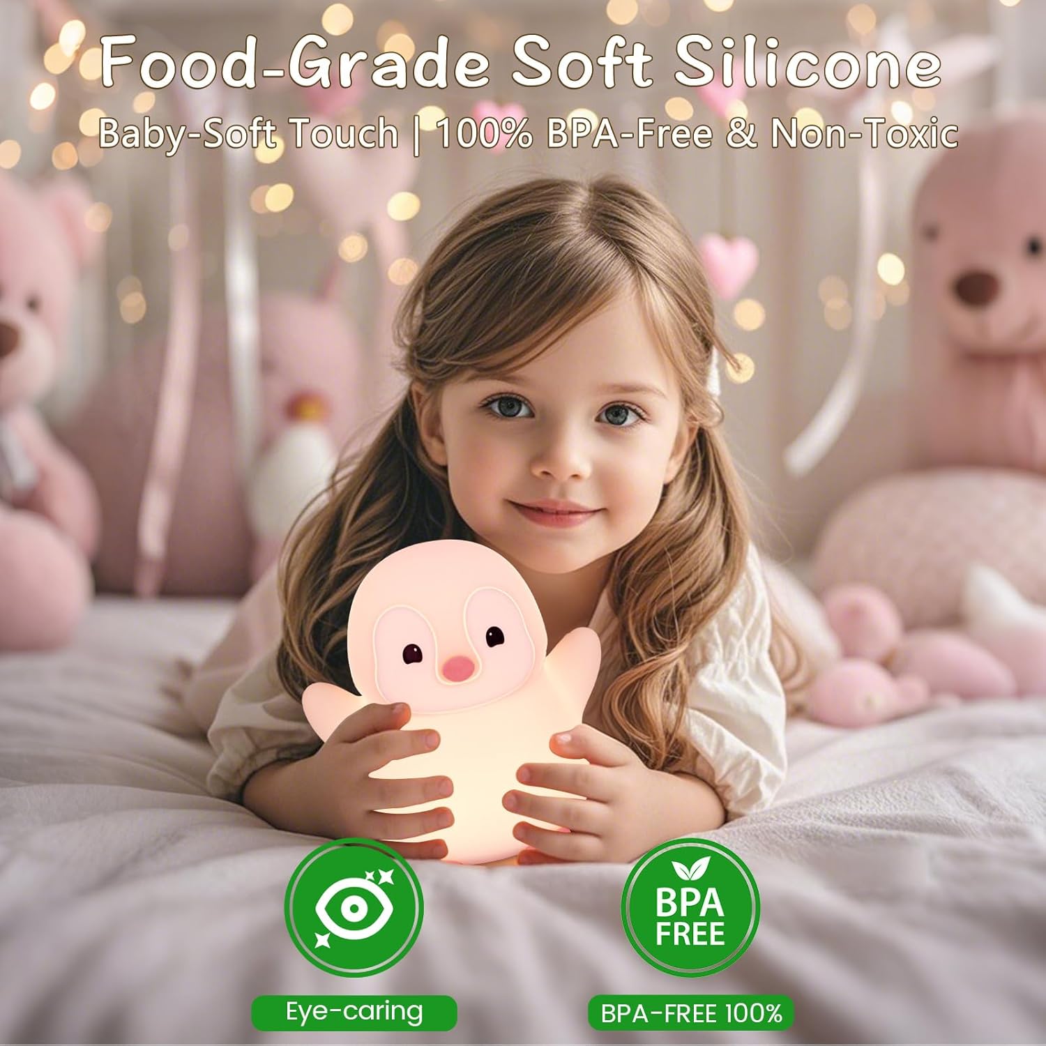 - Ultra-Squishy/Safe Food Grade Silicone Material: FAMIDUO penguin silicone night light made from premium squishy soft silicone, this pink penguin small lamp is 100% BPA-free and non-toxic, passed international safety certification (CE/FCC/CPC),perfect for kids/baby/pregnant women. Its squishy texture provides a calming sensory experience, doubling as a stress-relief toy.