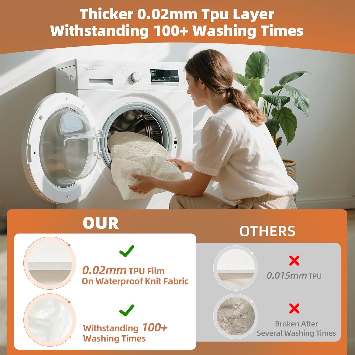 - THICKER 0.02MM TPU LAYER WITHSTANDING 100+ WASHING TIMES: Unlike cheaper king mattress protector which will break after 20 washes (leaving you with embarrassing leaks). The TPU we used of Lofe king mattress protector waterproof is 0.02mm which is much thicker than 0.015mm in the market. This means the waterproof mattress protector can withstand more washing times and still stay waterproof after washing. You just spend a little more money but get a more durable organic mattress protector equivalent to 10 ordinary mattress protectors.