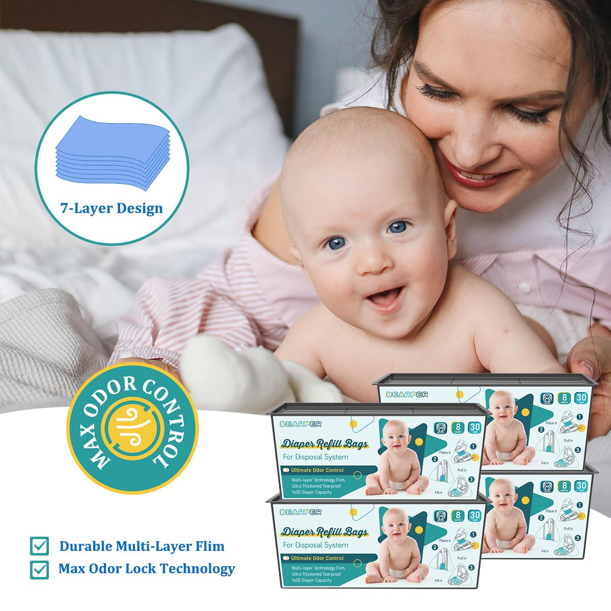 - LONG-LASTING REFILL: Each refill cartridge holds up to 1400 newborn diapers comes with 30 bags, Providing up to 8 months of continuous odor protection. Package includes 4-pack diaper bag refills (120 Bags)