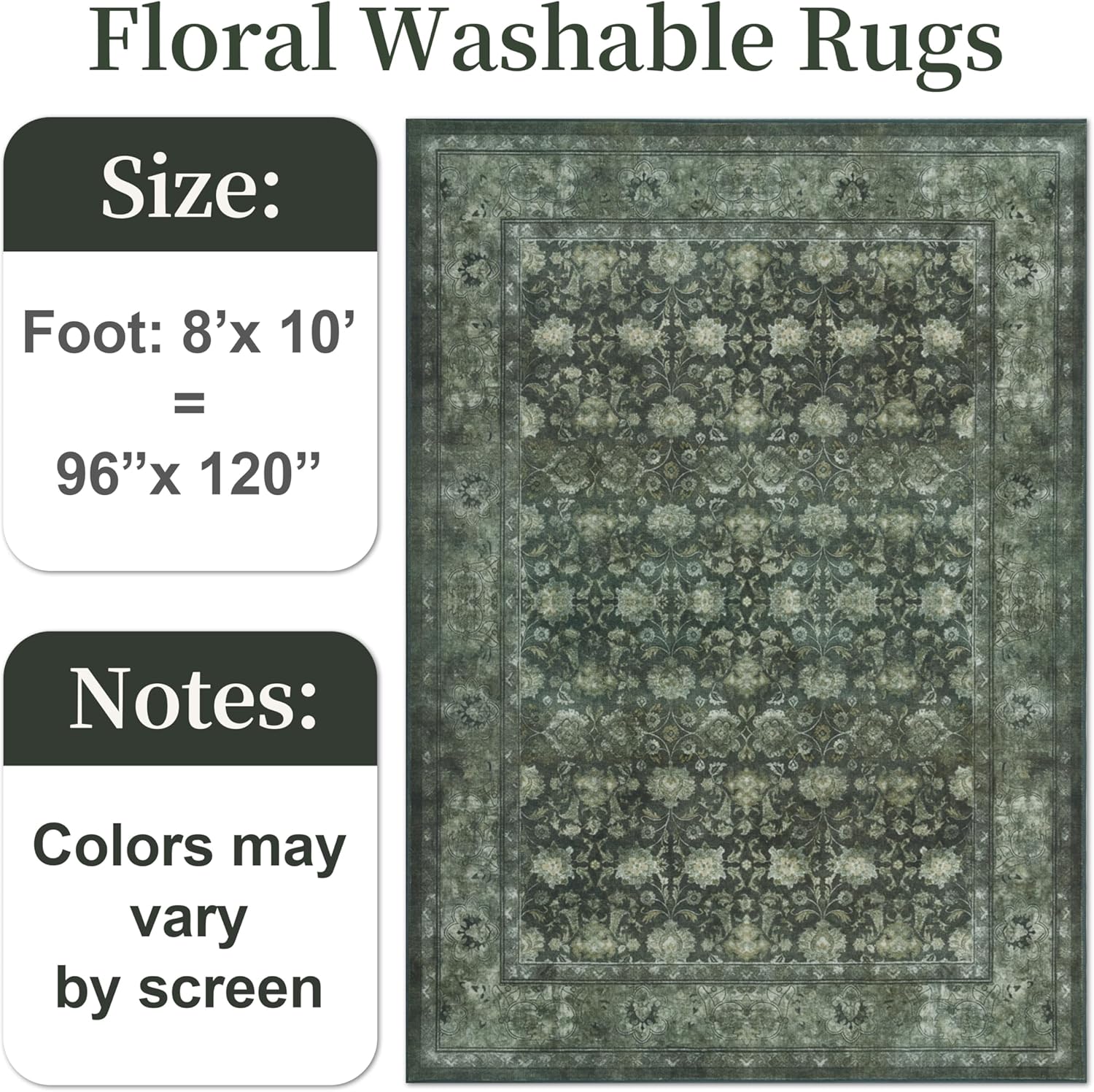 Large 8x10 Washable Area Rug for Living Room, Non Slip Vintage Traditional Rugs for Bedroom, Indoor Thin Accent Floral Nursery Carpet for Dining Room, Farmhouse (Distressed Green)