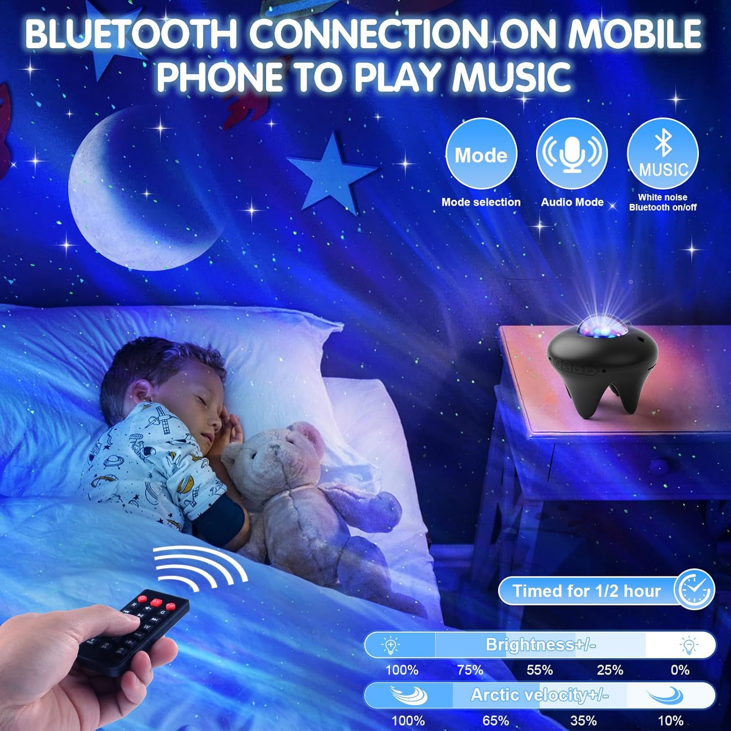 - 【Wonderful Music】The northern lights projector can play moving music through bluetooth connection on a mobile phone. After upgrading the sound quality effect, turn on the music mode and the lights will dance to the music, which is very suitable for family gatherings and parties.