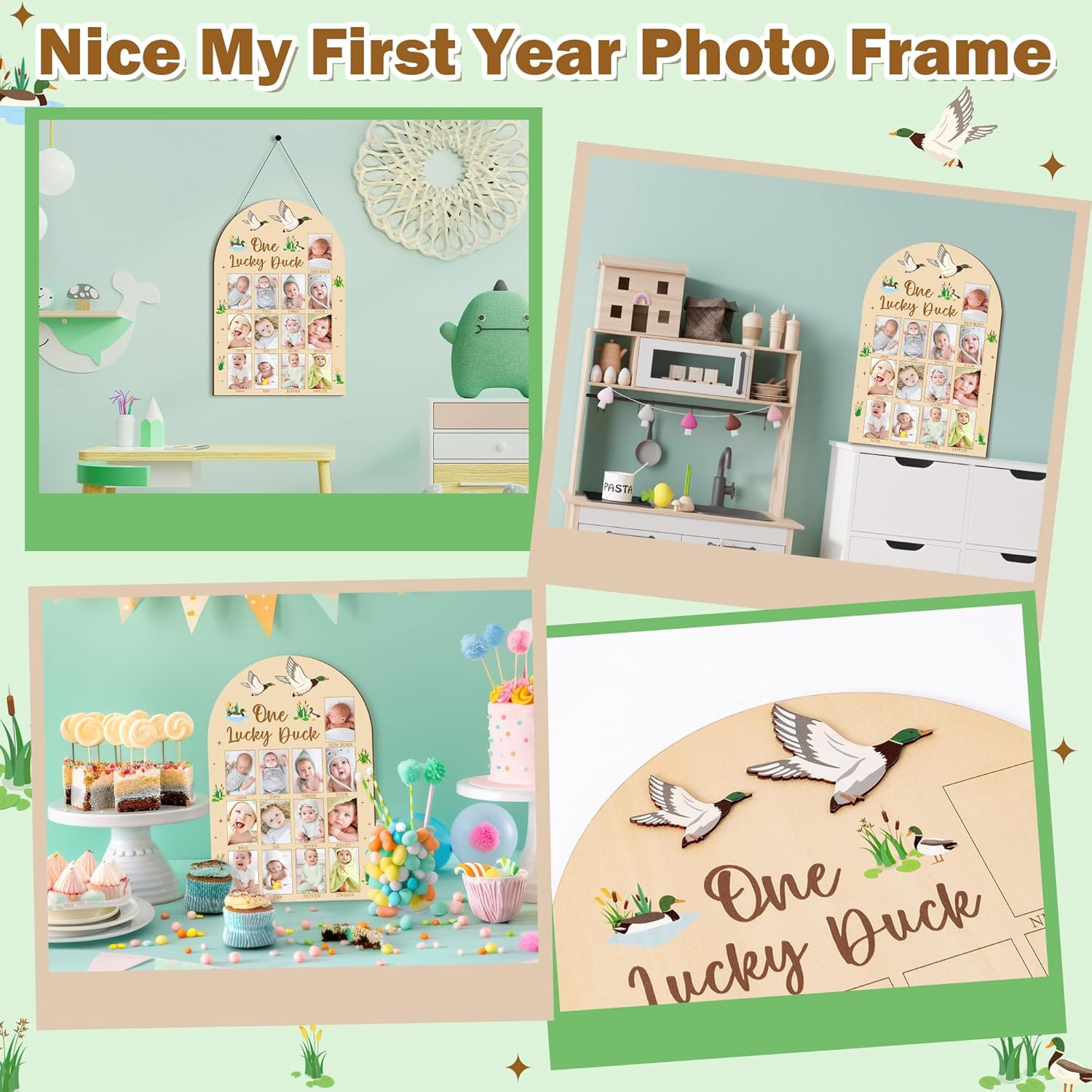 R HORSE 3D Mallard Duck 1st Birthday Wood Photo Display Board, One Lucky Duck Baby's First Year Picture Frame, 1-12 Months Milestone Board Birthday Decorations Keepsake Gift for Baby Nursery Decor
