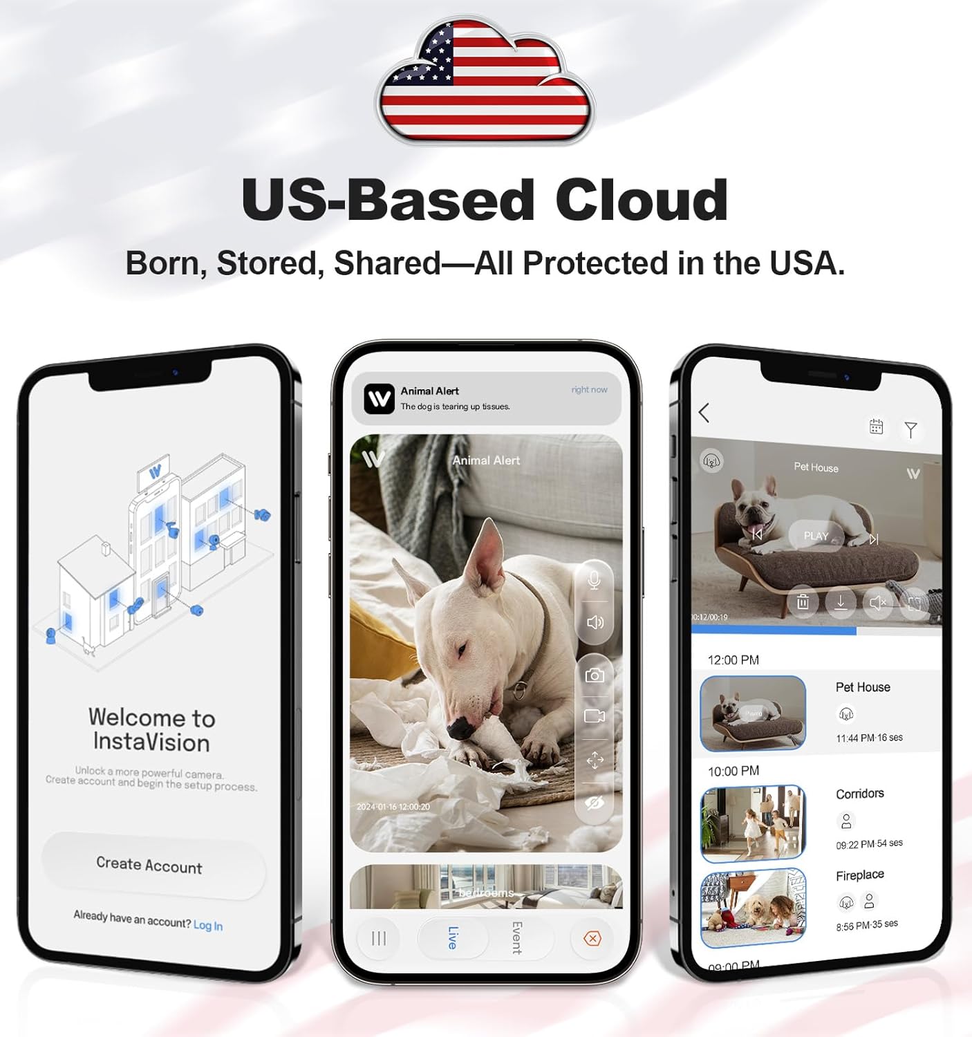 - 【Dual Storage Flexibility Cameras for Home Security Indoor】Enjoy encrypted data storage on American servers,recorded, stored, shared—all protected in the USA, and add a up to 128G TF card (SD card is not included) for local backup—ideal for privacy-focused users.