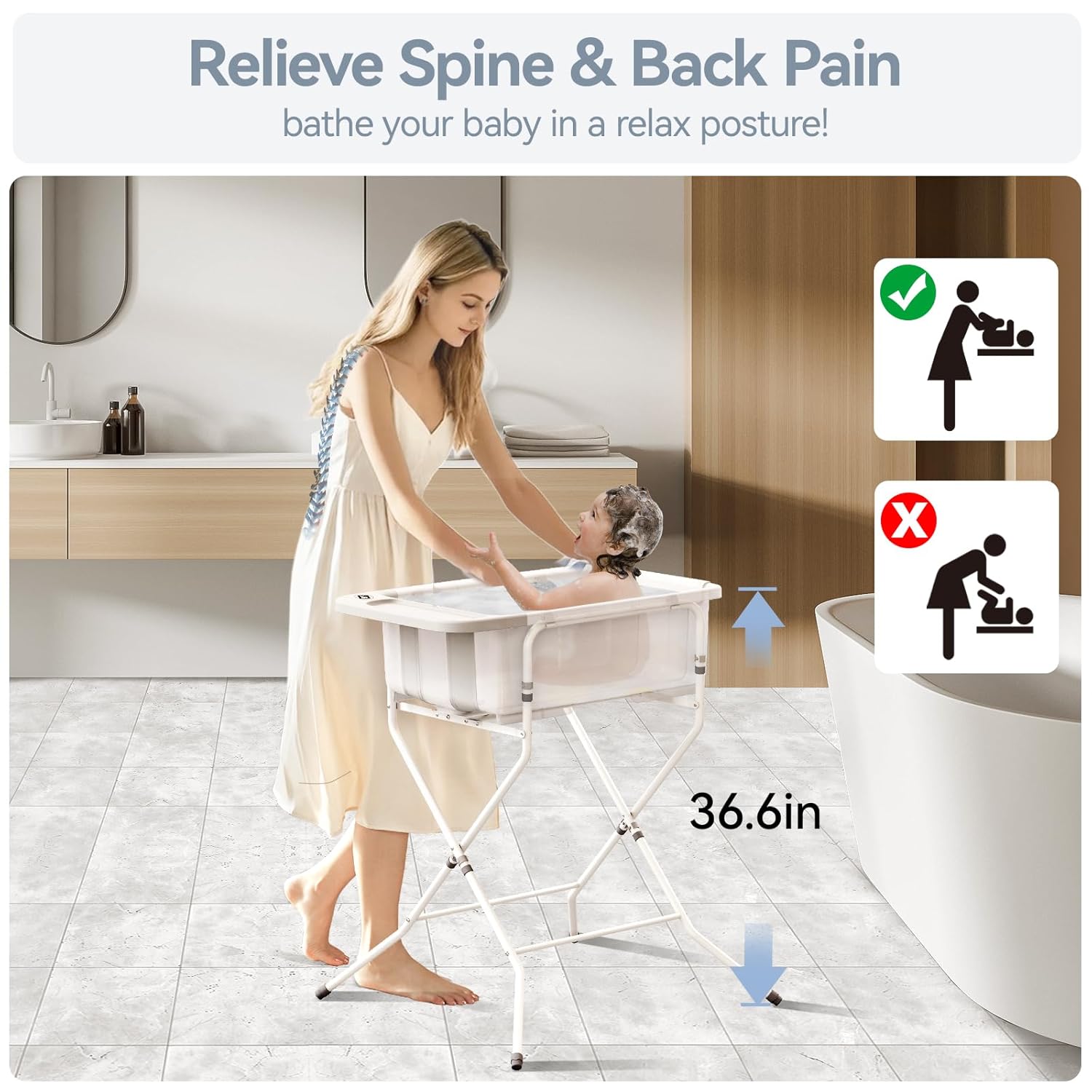 - 【Save Your Spine & Back】Engineered with ergonomics height, this baby bathtub with stand eliminates 90% of spinal & back strain caused by floor kneeling. Adapts to 150-200cm parents. No more numb legs or aching backs after bath time! The drain hole on the bottom can empty the water easily without bending over.