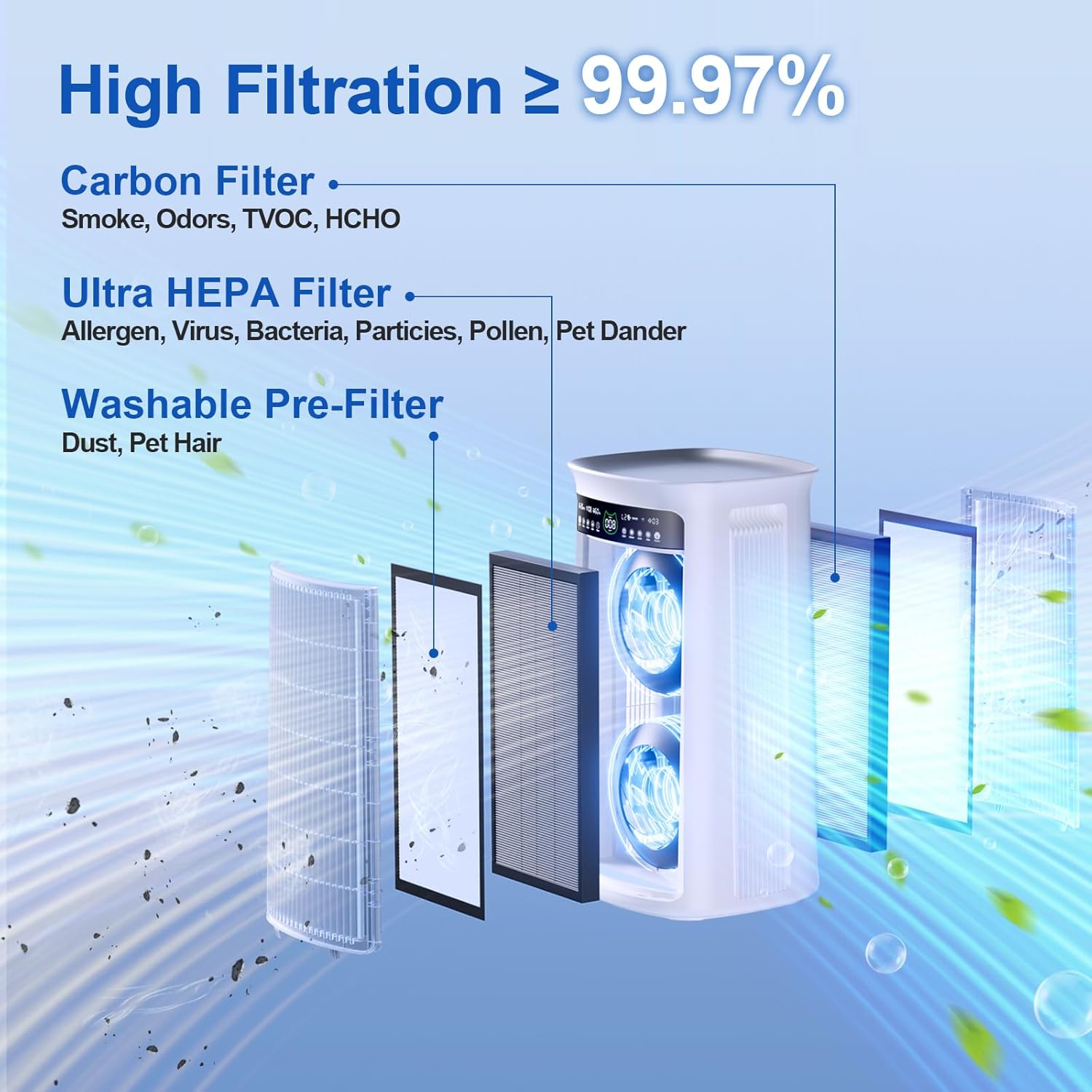 - Designed For People Affected By Wildfire Smoke: SOLEUSAIR air purifier is equipped with four layers of air filters, effectively capturing toxic smoke (a complex mixture of gases and fine particles produced when wood and other organic materials burn). Its effective removal rate of PM2.5 particles is up to 99.97%, and the effective removal rate of harmful gases such as formaldehyde and benzene is up to 99%.App tracks indoor/outdoor air quality in real time.