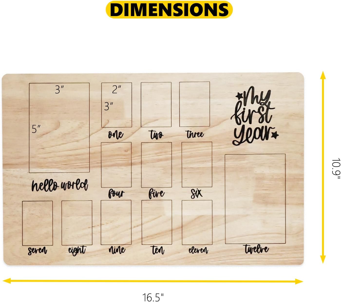 - SIZE & MATERIAL --- My first year milestone board measures 10.9" high x 16.5" wide. Made from Approx. 1/3"-thick premium wood, it's smooth, reusable, and resistant to fading or peeling. It fits 2" x 3" photos (wallet size) and is easy to use.
