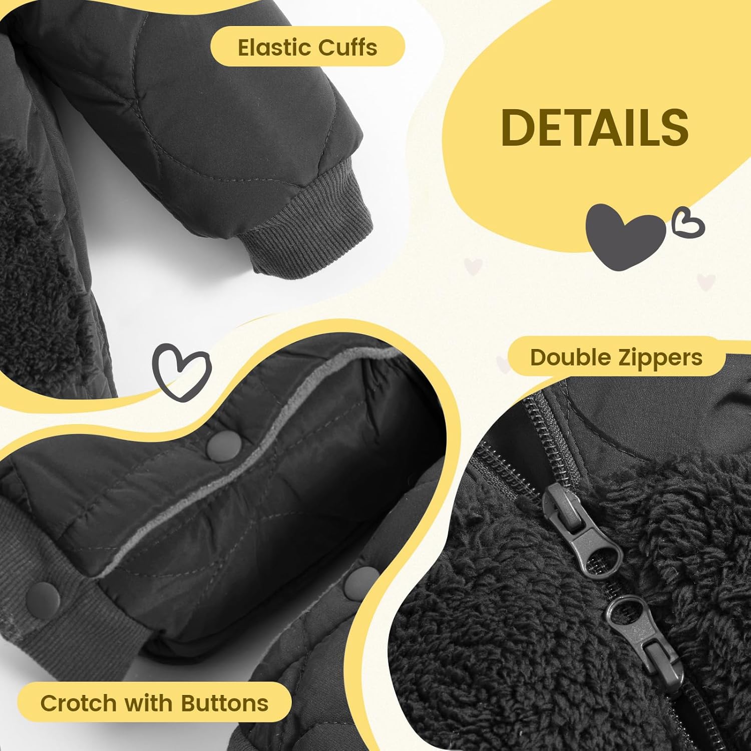 - [🐻Thoughtful Design]: JiAmy snowsuit toddler wear features a front zipper with crotch snaps for swift diaper changes and easy dressing, Fleece lined pockets to keep tiny hands cozy, and ribbed cuffs that lock out drafts while securing sleeves, making these baby winter clothes the practical choice for active kids.