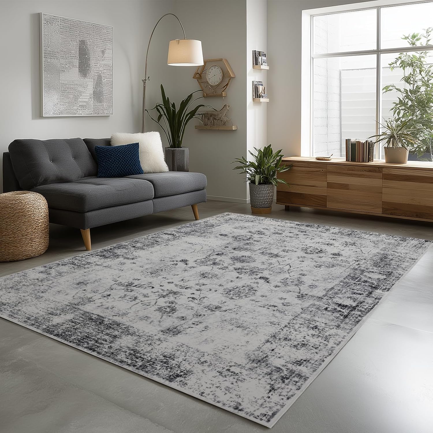 4x6 Washable Area Rug for Living Room, Carpet for Bedroom, Soft Faux Wool Retro Dining Room Rug, Non Slip&Non-Shedding Resistant Low Pile Vintage Print Rug for Home Office (White/Grey)