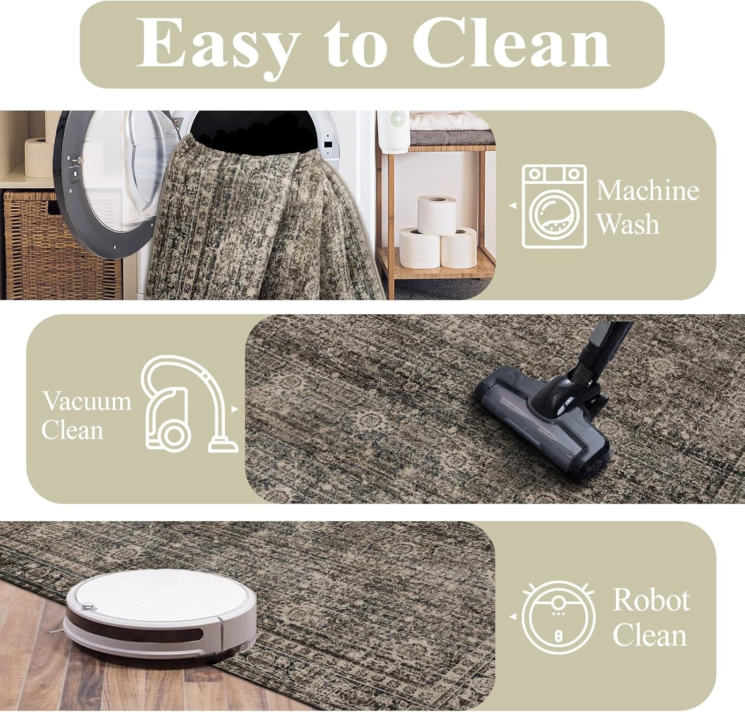 - Machine Washable This 9x12 washable rug features a short pile design that's easily maintained with upright or robotic vacuum cleaners. The large area rug is completely machine-washable for quick, hassle-free cleaning of your living room carpet or bedroom floor covering. After washing, use a low-temperature iron to restore the carpet's smooth surface.