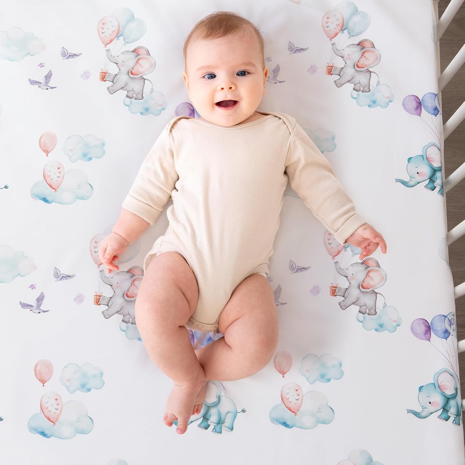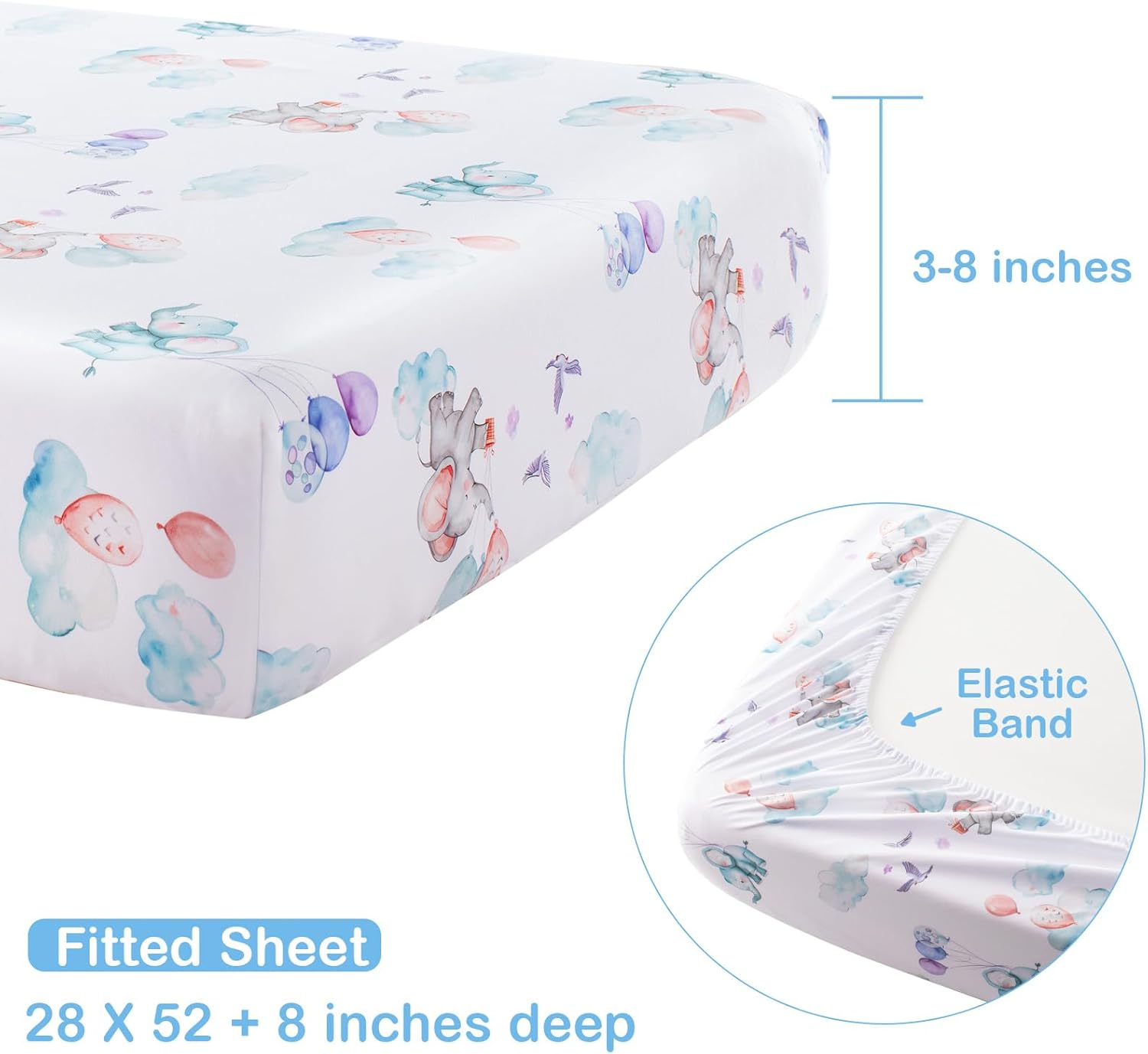 4 Piece Crib Bedding Set for Boys Girls, Infant Toddler Nursery Baby Bedding Sets Includes Cartoon Quilt, Fitted Crib Sheet, Crib Skirt and Plush Elephant Toy