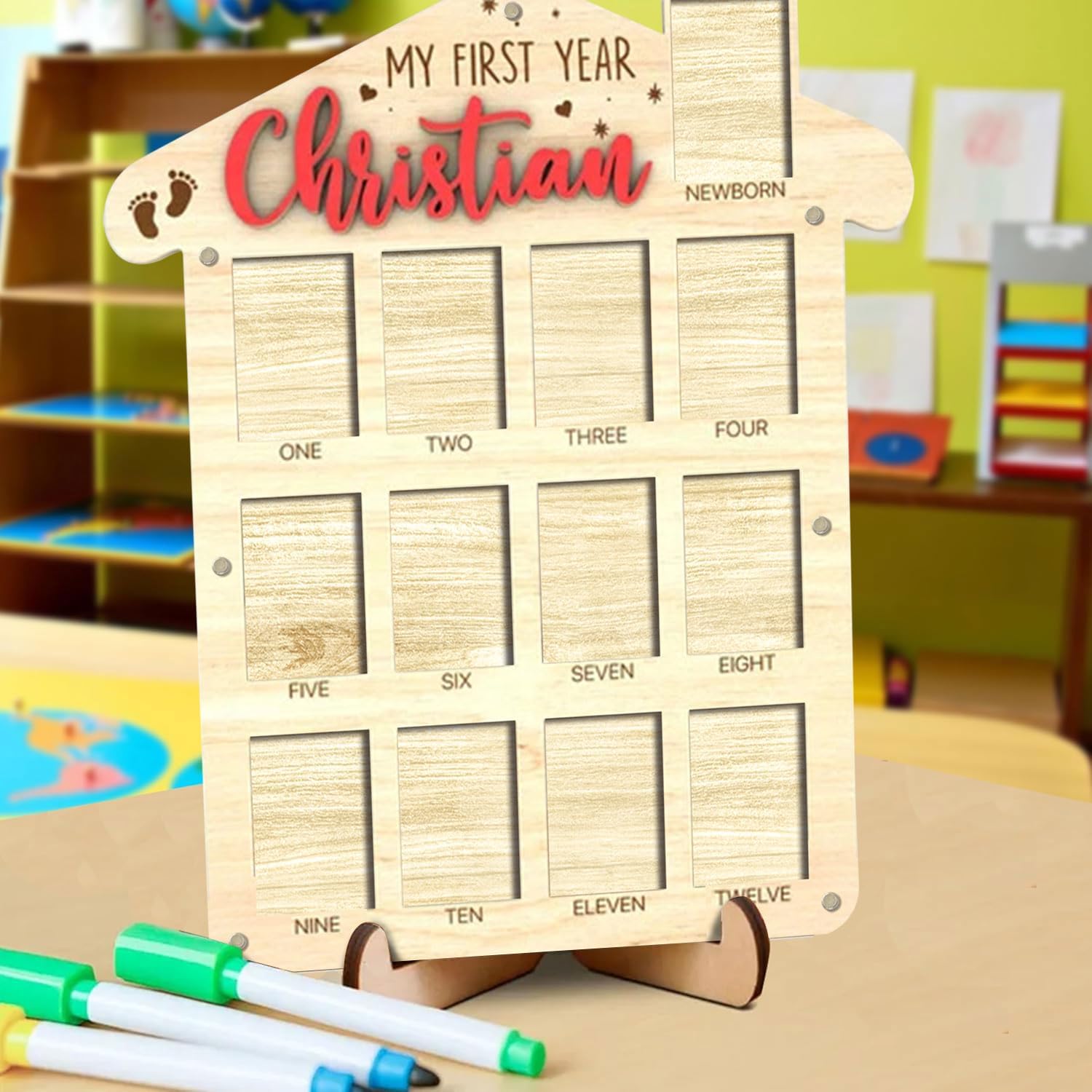 - My First Year Photo Frame: Capture your baby’s first year with our babys first year picture frame. This baby first year photo frame helps you record their growth from newborn to one year, showcasing each milestone in a 12 month picture frame for baby first year. The wooden plaque includes space for your baby’s full name, making it a personalized keepsake. Our 12 month pictures for baby first year, my first year photo board, one year photo board is a wonderful way to celebrate these moments.