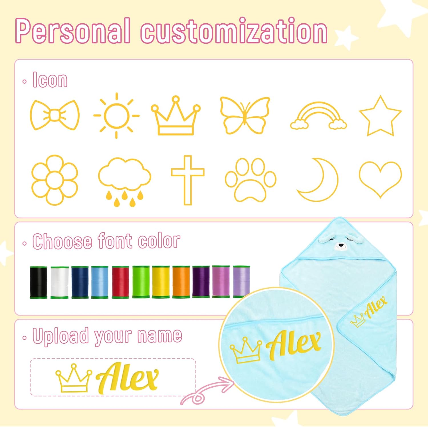 - Customize Now: Personalized baby bath towels can add the baby's name and cute pattern, embroidery or color printing. Chic and colorful animal face hood and custom designs will make the little one unique. It will be a special baby shower gift!