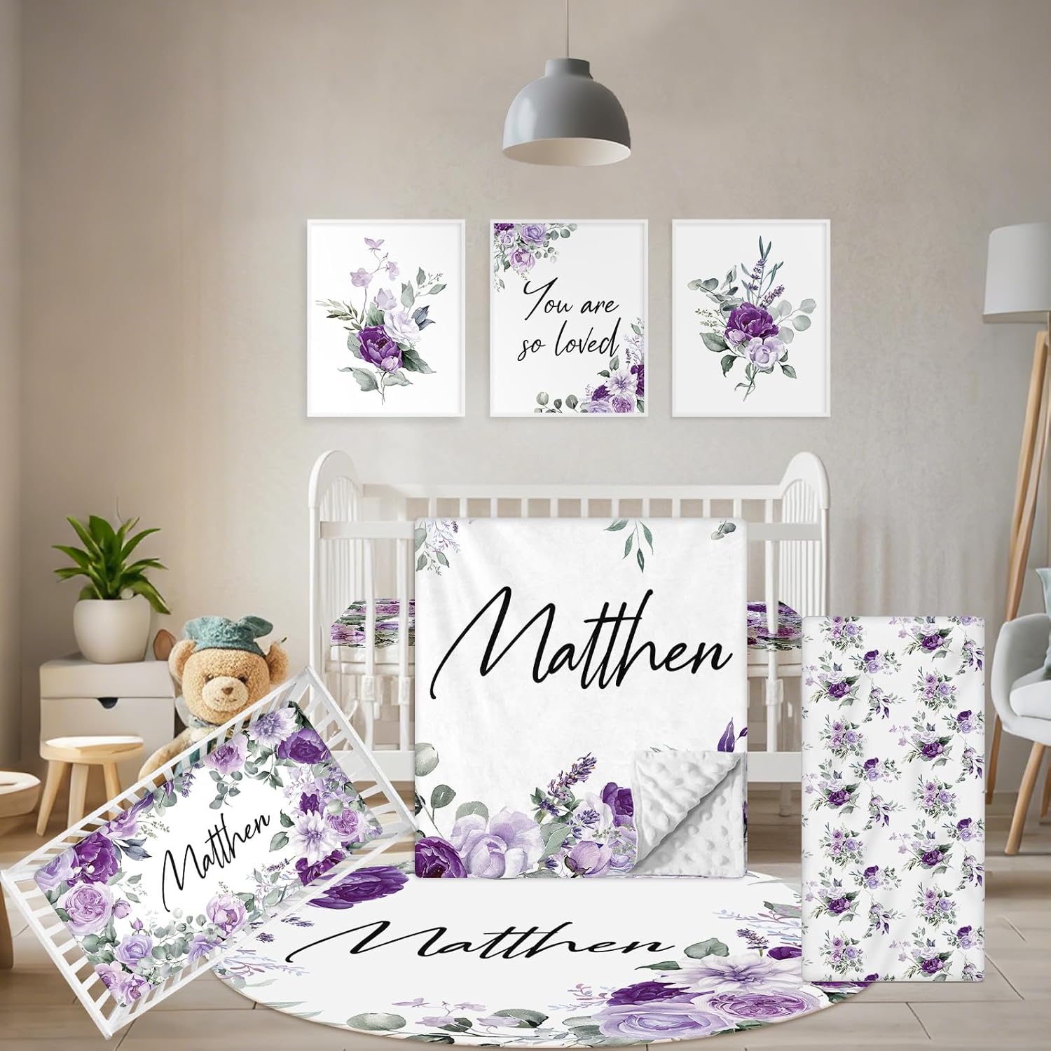 Personalized Baby Bedding Set - 5 Pcs Custom Toddlers Bedding Set with Infant Name - Soft Double Layer Nursery Crib Set for Girls Boys - Customized Infant Gifts for Baby Shower - Purple Flowers