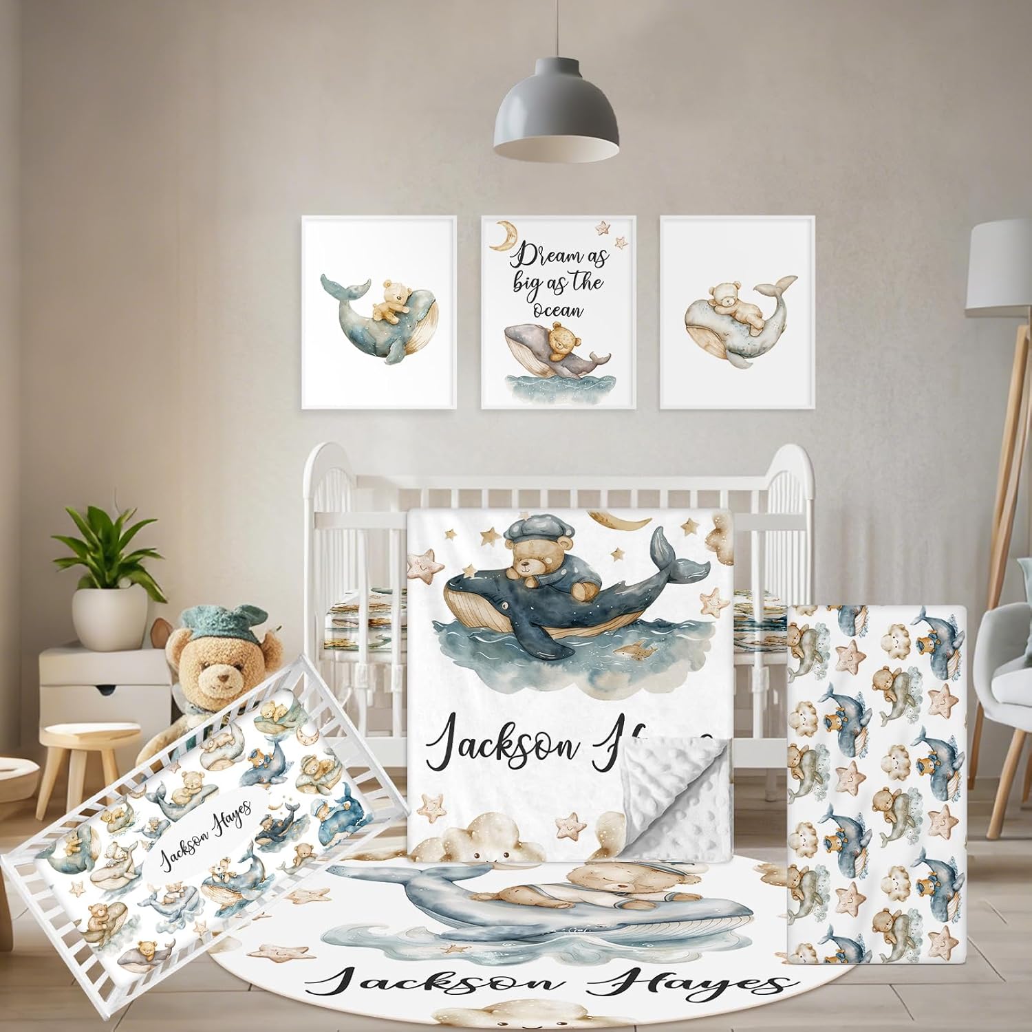 - Complete Set: This customized baby bedding set includes a double layer dotted backing blanket, crib sheet, changing pad cover, baby rug and wall arts, designed to add style and comfort to your nursery. The dotted backing of the double-layer blanket will be adored by your little one.