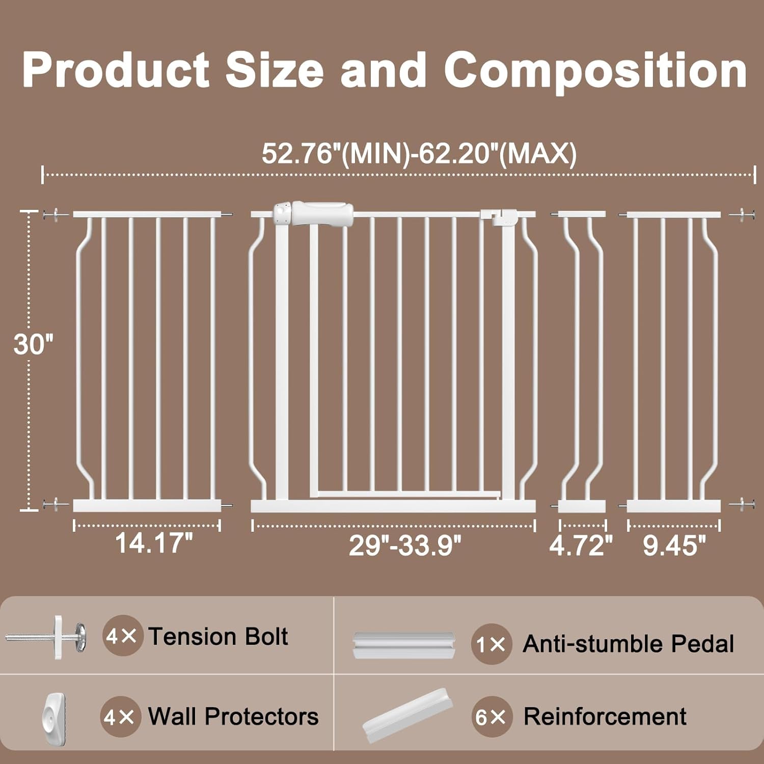 WAOWAO Baby Gate 52.76-62.2" Extra Wide Pressure Mounted Walk Through Swing Auto Close Safety White Metal Toddler Kids Child Dog Pet Puppy for Stairs,Doorways,Kitchen