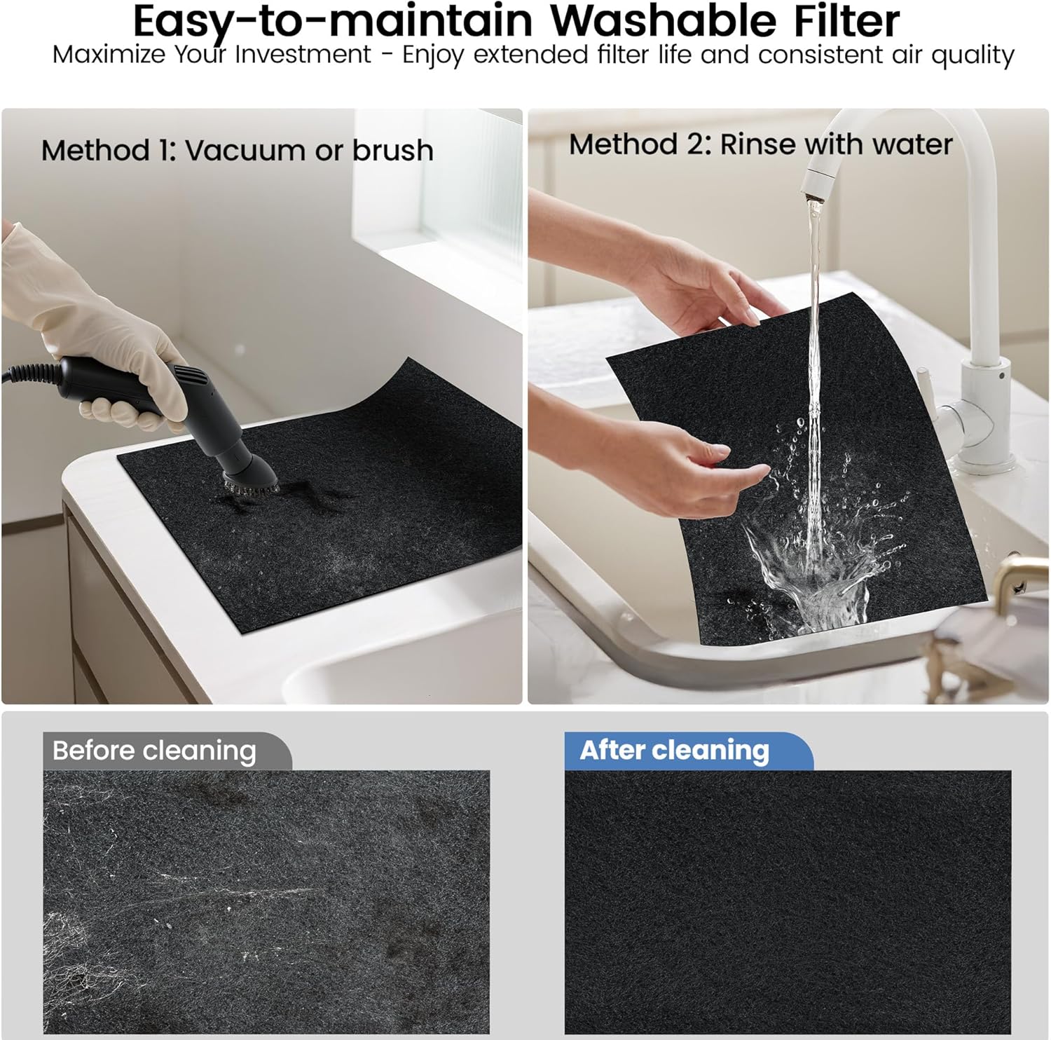 - 【Washable Pre-Filter & Smart Filter Replacement Reminder】 LUNINO air purifiers for home pets features a washable filter that restores performance with a simple rinse, improving filtration efficiency by 30%. This washable design reduces replacement frequency, saving you money. This room air purifier also features a built-in smart filter replacement reminder that accurately tracks usage. A one-touch reminder button illuminates when a replacement is due, preventing secondary contamination caused by expired filters.