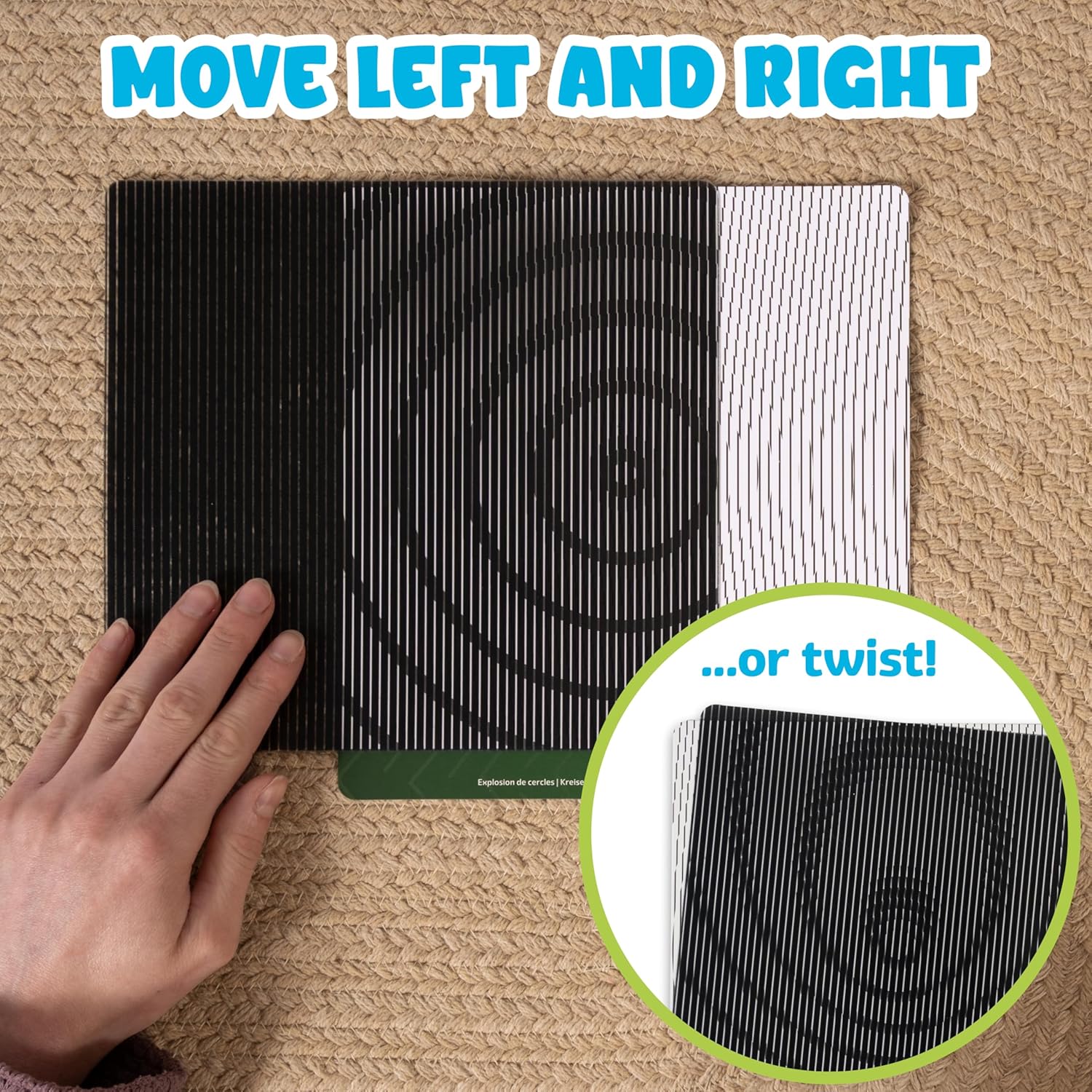 - 12 CARDS AND 2 SLIDERS -- This set of visual sensory toys comes with 12 different designs. Drag the motion sliders across the cards to create dazzling visual illusions. Bring each pattern to life!