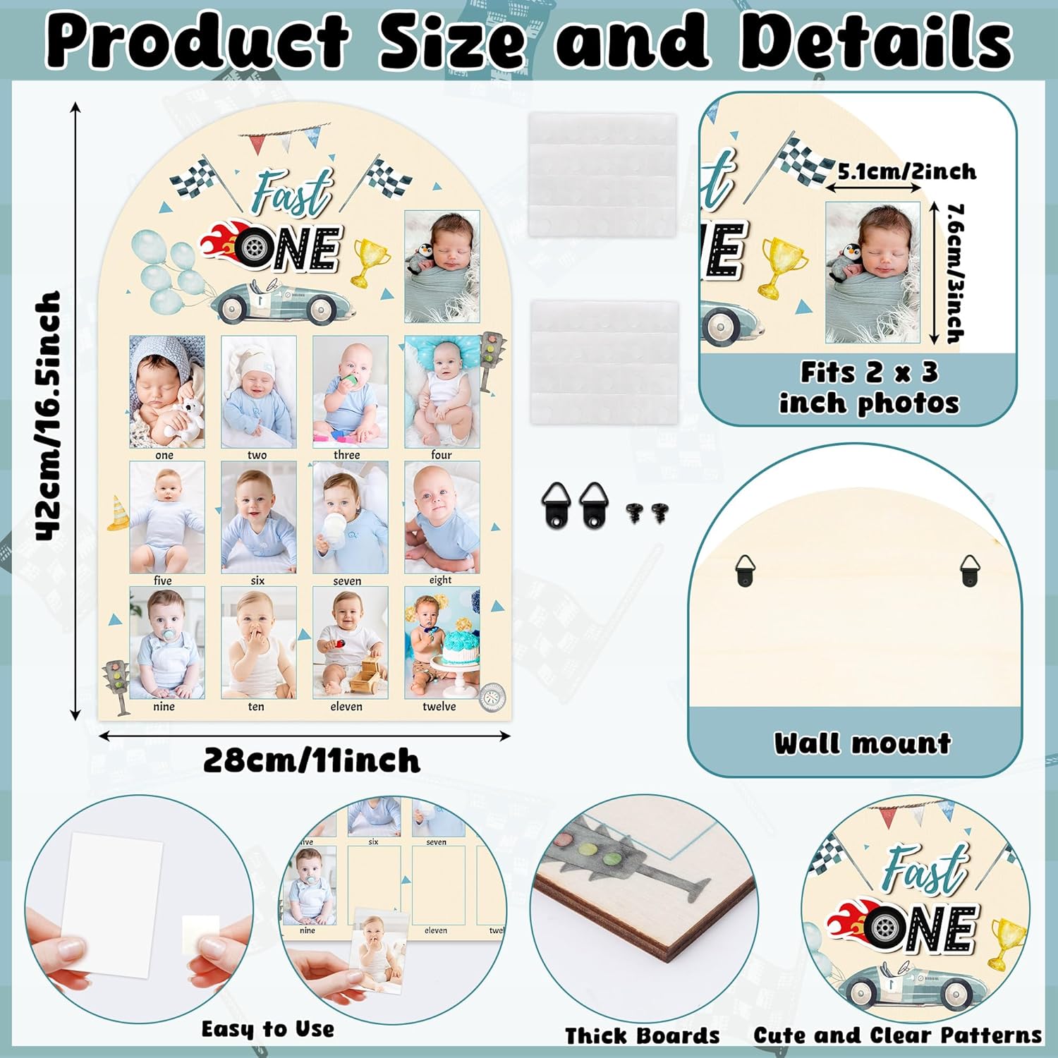 - Easy to Use: Simply insert your baby's photos into the 12 slots to create a personalized display. The spacious area allows you to add baby's name and birth date, making this race car birthday decoration a truly unique keepsake. Celebrate joyous milestones with this easy-to-use photo board.